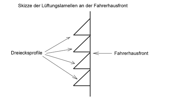 gemäß Zeichnung so an der Fahrerhausfront angebracht, dass die lange